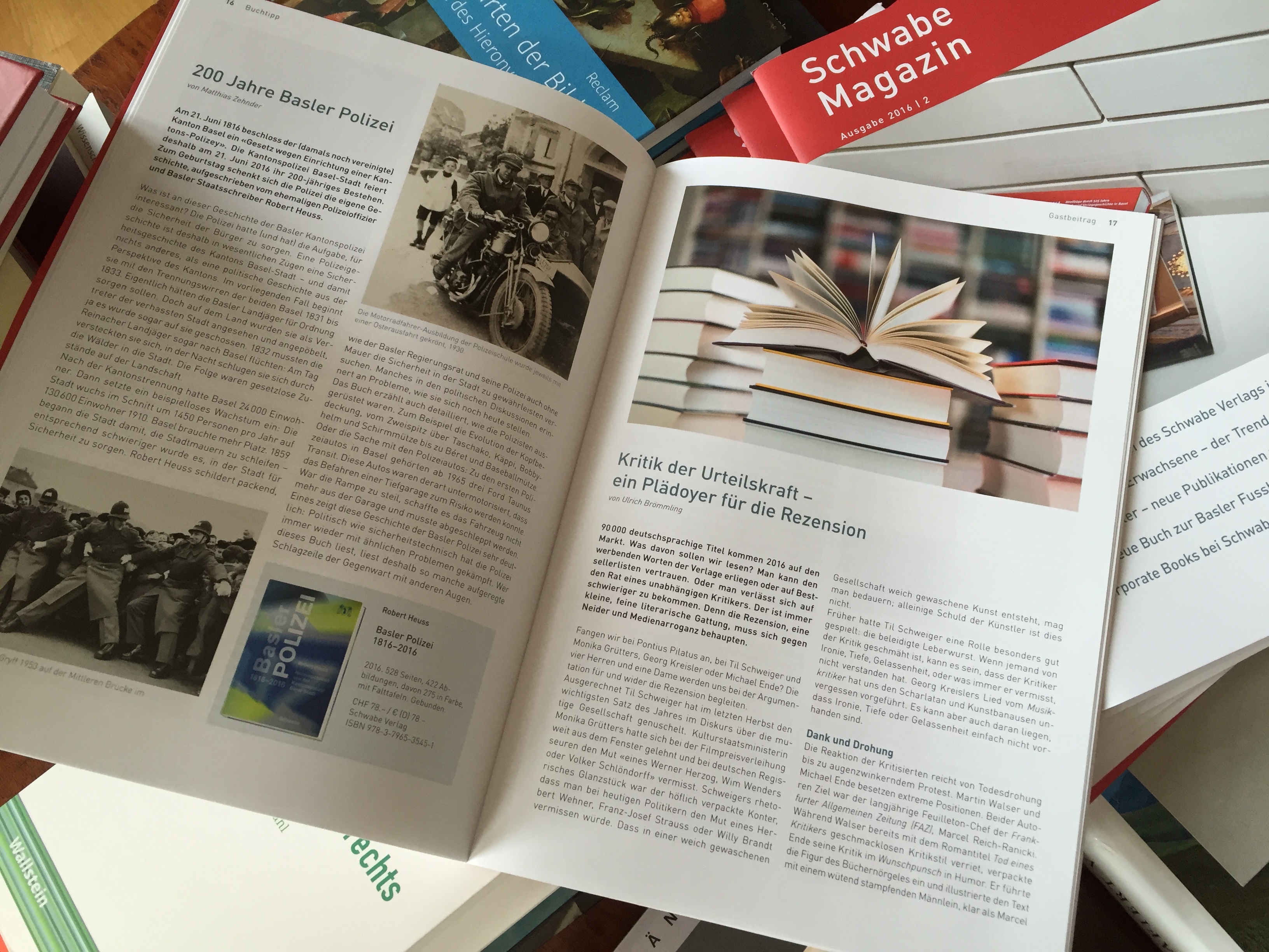 Heute erschienen: Brömmlings Gastbeitrag im Schwabe Magazin zum Wesen der Rezension unter dem Titel “Kritik der Urteilskraft”. Brömmlings Artikel inVIERVIERTELKULT vom vergangenen Herbst war einigen Verlagen aufgefallen. Für das Magazin des Schwabe Verlages hat Brömmling seinen Artikel, in dem so unterschiedliche Charaktere wie Pontius Pilatus, Til Schweiger, Monika Grütters, Georg Kreisler und Michael Ende eine Rolle spielen, um den Zitierstreit zwischen Verlagen auf der einen Seite und Tagesspiegel und Süddeutscher Zeitung auf der anderen erweitert und insgesamt aktualisiert. Den ganzen Artikel entweder im Schwabe Magazin auf den Seiten 17-18, bei broemmling.de oder als pdf: 2 – Schwabe_Magazin_2_2016_Brömmling